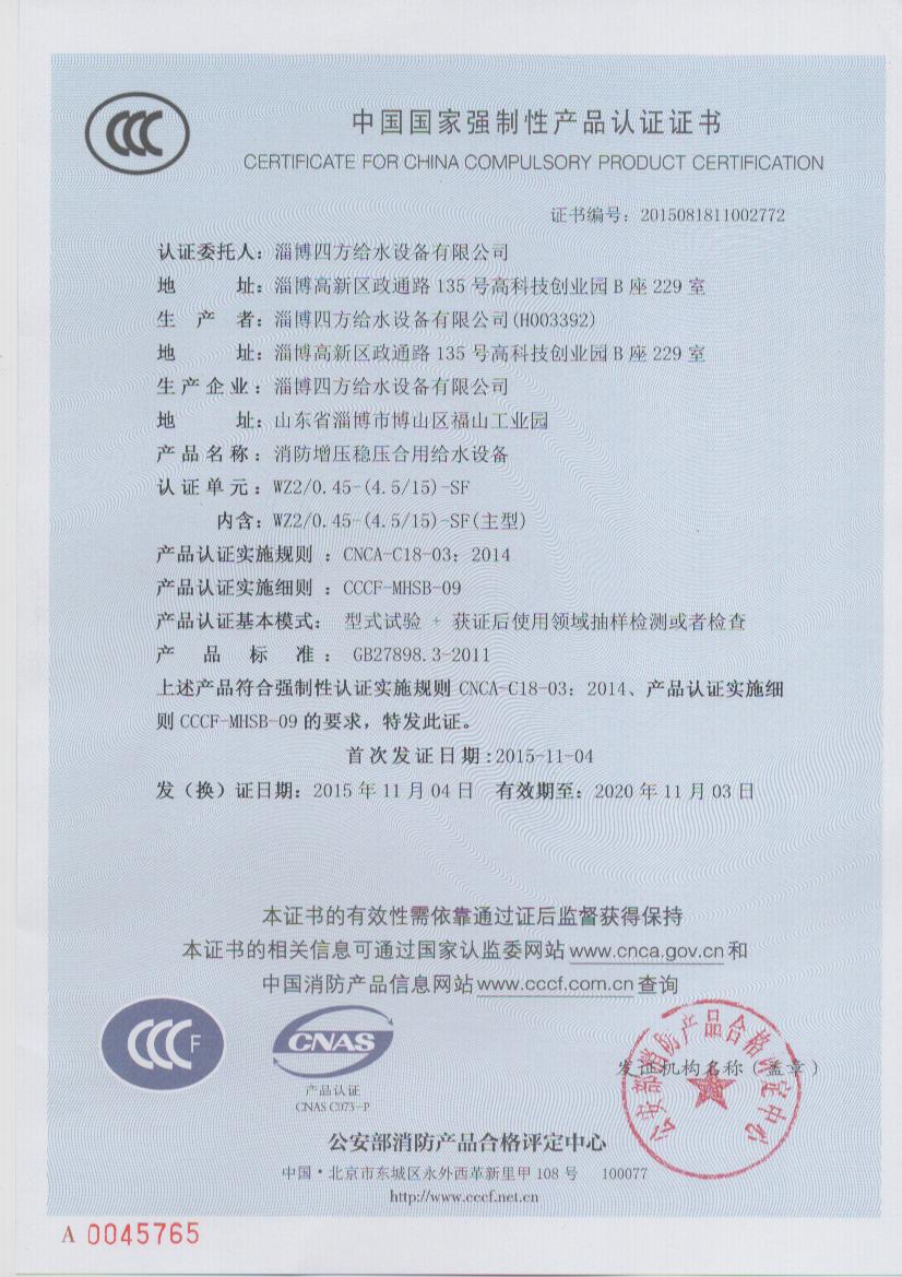 我公司生產(chǎn)的消防增壓穩(wěn)壓合用給水設(shè)備近期獲得中國國家強(qiáng)制性產(chǎn)品認(rèn)證證書,由公安部消防產(chǎn)品合 格評定中心,于2015年11月4日正式頒發(fā)認(rèn)證證書,成為本地區(qū)首先獲得消防3C認(rèn)證證書的企業(yè)。